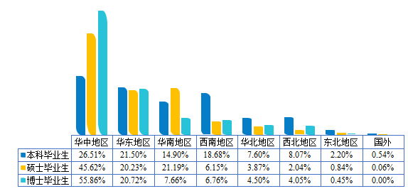 就业区域:华中地区(37.94%)为2023届毕业生就业主战场,华东地区(20.78%)和华南地区(18.05%)次之。不同学历毕业生就业区域分布详见下图。
