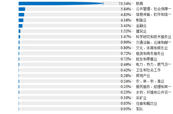 教育42.68% 制造业17.28% 信息传输、软件和信息技术服务业8.64% 公共管理、社会保障和社会组织 7.23% |