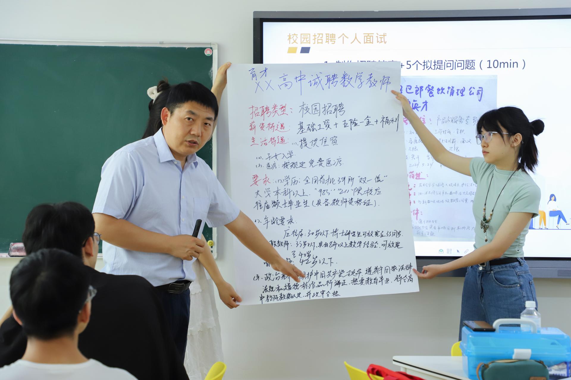 课程主要围绕职业优势探索、就业信息搜集与管理、简历制作、面试技能提升等方面开展,针对中小学教师求职方向,任课教师着重介绍了教师招聘的基本流程,并强调了教师岗位胜任力的重要性。