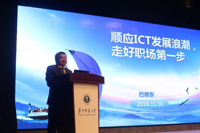招生与就业工作处主办 、教育信息技术学院承办的第三期就业大讲堂“顺应ICT发展浪潮,走好职场第一步”在九号教学楼6楼演播厅顺利举办。本次讲座同时为2018年讲好信技故事校友专场,由教育信息技术学院(原信息技术系)教育技术学专业1993级校友,中国信息通信科技集团武汉长江通信智联技术有限公司董事、总经理巴继东先生主讲。信技学院党委副书记钟文锐出席,院团委书记胡尉尉以及来自全校一百多名学生参加了讲座。