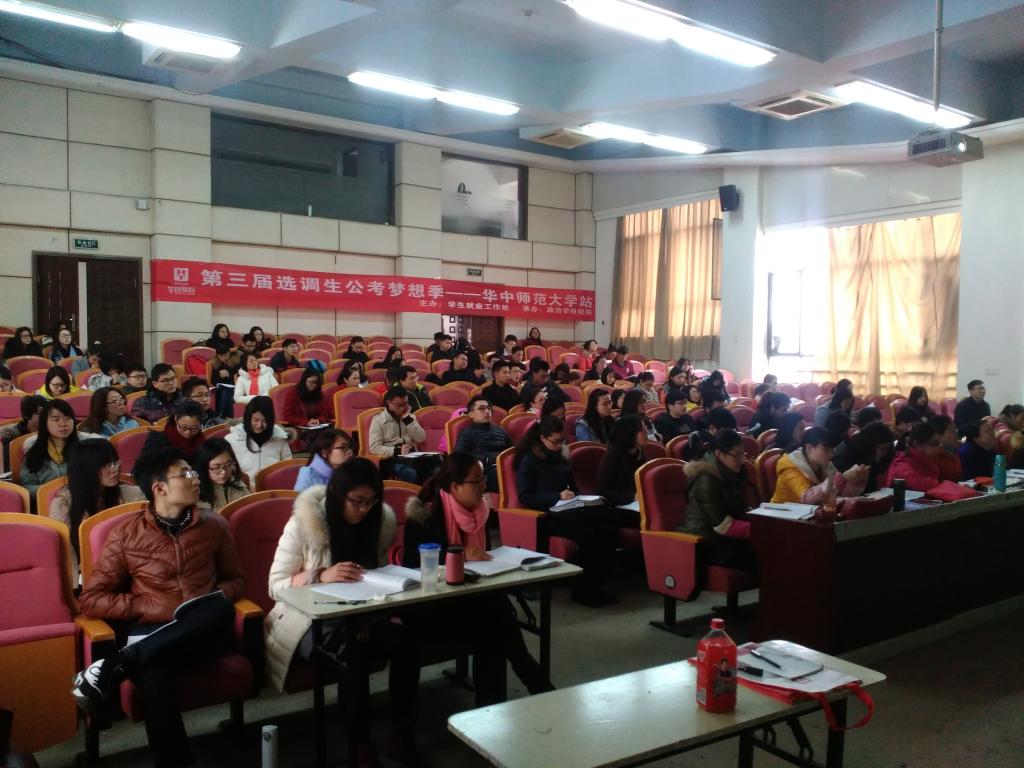 9号楼1楼报告厅成功举办。本次培训由校学生就业工作处主办,政治学研究院承办,邀请了华图教育湖北分校名师为报考2016年湖北省选调生考试的应届毕业生开展为其4天的免费培训。