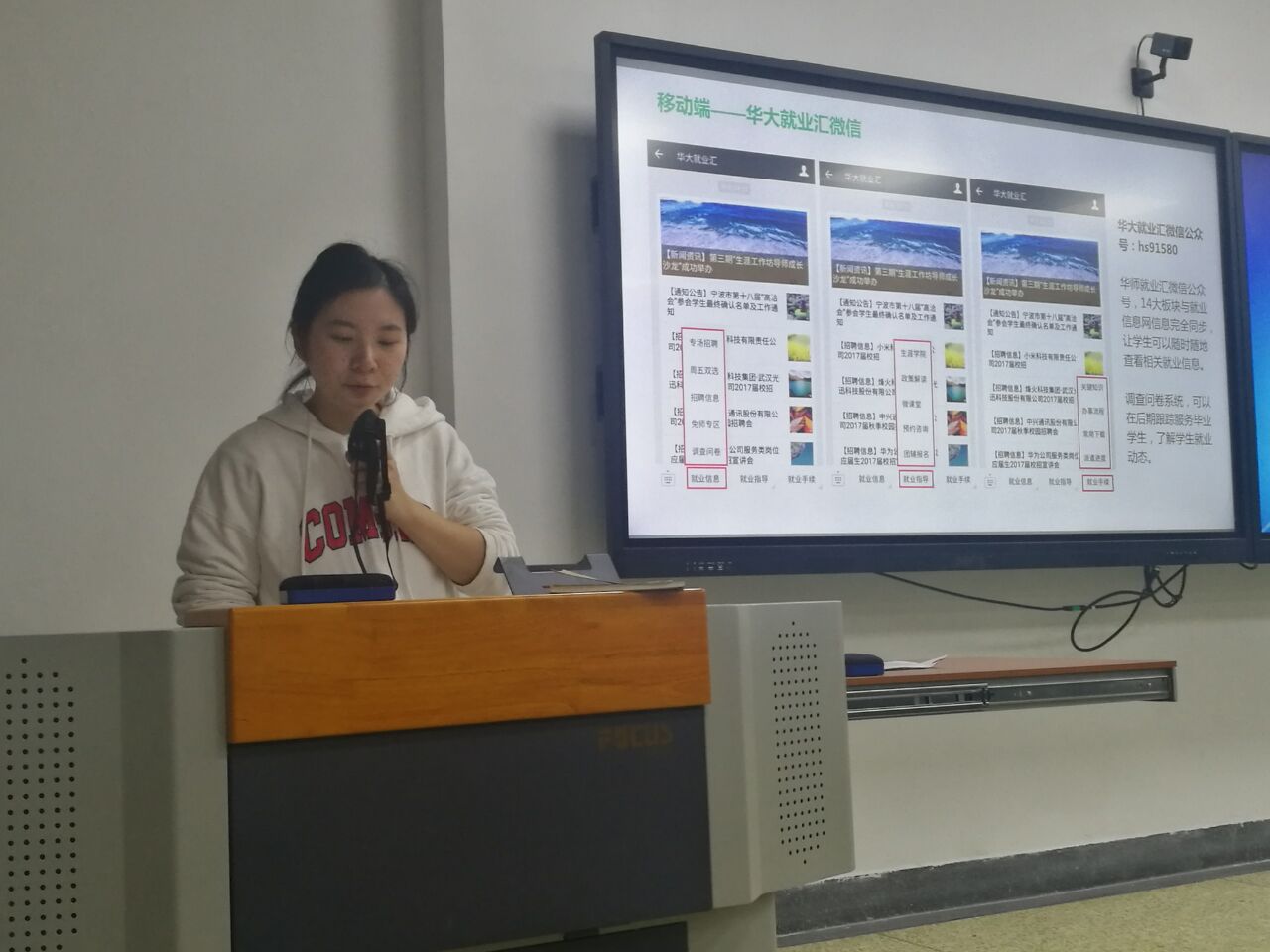 最后,卢老师向大家推荐了学校的华大就业汇微信公众号和华大就业汇APP,并特别对其中的就业指导板块作了详细介绍,引导学生利用好学校丰富的就业资源,广泛搜集就业信息,提升自己的就业能力。