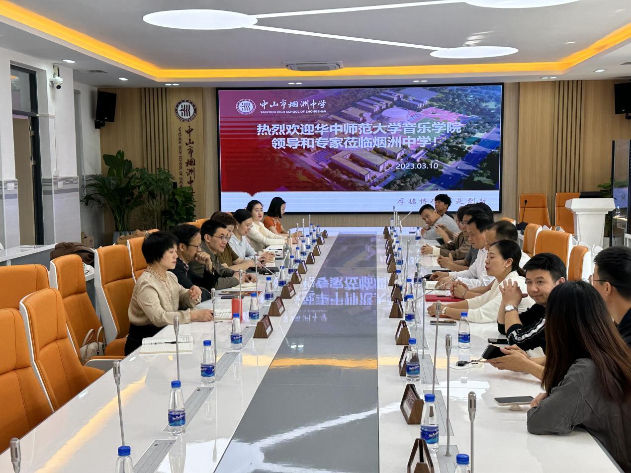 胡光裕、梁志强及中山市音乐学院毕业生代表参加座谈会,会议由烟洲中学音乐科组长、音乐学院2001级校友曾琰主持。胡光裕介绍了烟洲中学的创办经历、师资力量、人才培养等各方面的情况,双方就如何打造中学高水平艺术社团、改进音乐学院人才培养方案、提升音乐学院学生教学实践能力进行了充分交流和讨论。