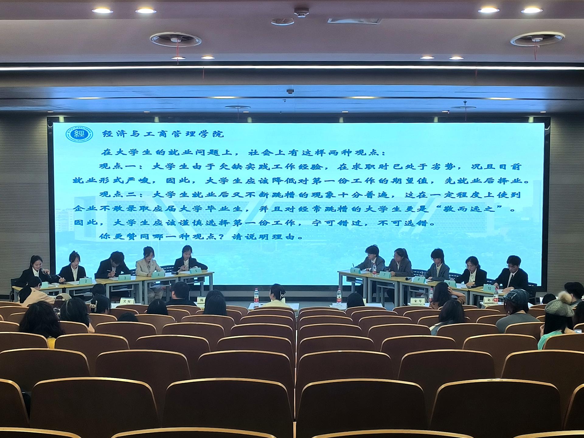 在第一环节中,选手们假定求职、考研、保研、考公面试等场合做了自我认识和职业生涯规划等相关介绍,从多维度展开,介绍自己的经历、荣誉以及与目标求职岗位相匹配的优势。随后进行第二环节无领导小组讨论,选手有三分钟时间现场阅读材料、思考答案,每位选手有一分钟时间依次简单阐述个人观点,共有十五分钟小组讨论时间和两分钟总结发言时间。选手们关于大学生就业问题的两种不同社会观点踊跃发言,积极讨论,结合社会客观实际和理论依据交流观点,组织协调,充分展现了选手各方面的综合能力。